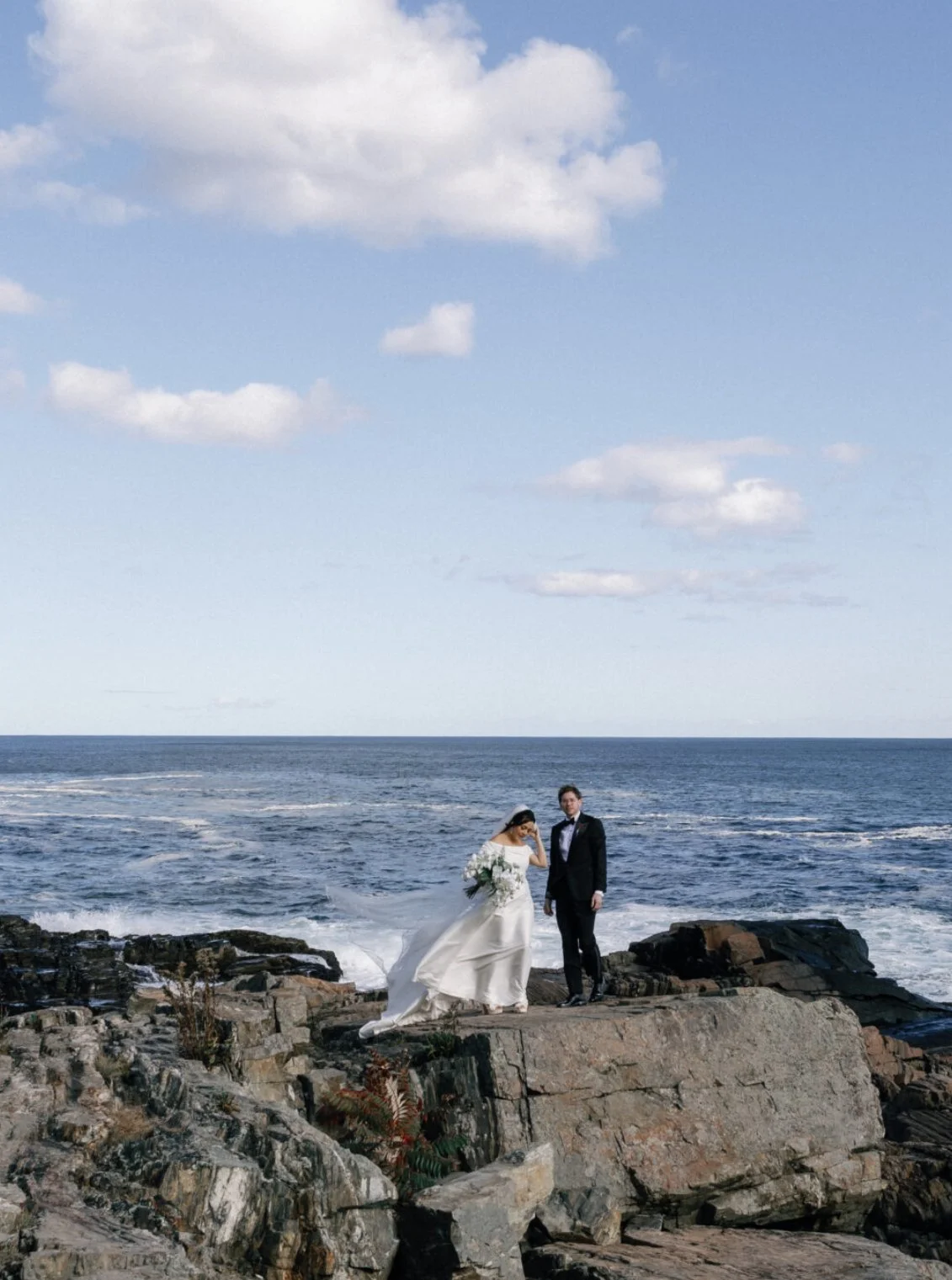 For Madeline & Charlie’s fall coastal wedding, Madeline wore the Cortlan Gown by Louvienne from Lovely Bride, paired with our cathedral length Madeleine Veil with a blusher. The two were married on October 8th, 2023 at Cliff House in Cape Neddick, Maine.